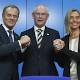 media Le Premier ministre polonais Donald Tusk (g) et la ministre italienne des Affaires étrangères, Federica Mogherini (d) sont félicités par le président sortant du Conseil, Herman Van Rompuy (c). Bruxelles, le 30 août 2014. REUTERS/Yves Herman.